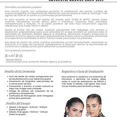 Estimados estudiantes y padres: Con mucho orgullo, nos complace anunciar la celebración del evento cumbre de nuestra academia, la Ceremonia de Premiación, que se llevará a cabo el domingo, 18 de enero de 2026 a las 3:00pm en el Salón de Actividades del Hipódromo Camarero en Canóvanas. En esta ocasión, el tema del desfile de modas será "OWN THE SPOTLIGHT", donde todos nuestras estudiantes lucirán estilos glam, utilizando telas satinadas, lentejuelas, vinyl y acrílicos. En la parte posterior de esta hoja encontrarán algunas referencias a la moda "OWN THE SPOTLIGHT". Desde el primer día de clases, nuestros estudiantes han trabajado con esmero y dedicación, preparándose para esta actividad en la que pondrán en práctica todo lo aprendido en Authentic Models Agency & Academy, abarcando imagen, proyección y pasarela. Estamos seguros de que cada estudiante brillará sobre la pasarela, ofreciendo una experiencia inolvidable al estilo "fashion week" para todos los presentes. Nos llena de ilusión ver cómo nuestros estudiantes se han transformado, mostrando su evolución a lo largo del semestre. Agradecemos a todos por darnos la oportunidad de conocerlos y trabajar juntos para desarrollar su autenticidad. Tendremos ensayos: - Sábado, 10 de enero - 10:00 am - 12:00 pm (todos los grupos) - Sábado, 17 de enero - 10:00 am - 12:00 pm (todos los grupos) Para recibir la carta con todos los detalles y las tendencias de vestimenta de cada grupo, favor comunicarse a la academia al 787-792-1040. *La cuota de $180 dólares les incluye 4 boletos. Si desean boletos adicionales, los pueden adquirir a $40 dólares cada uno.*